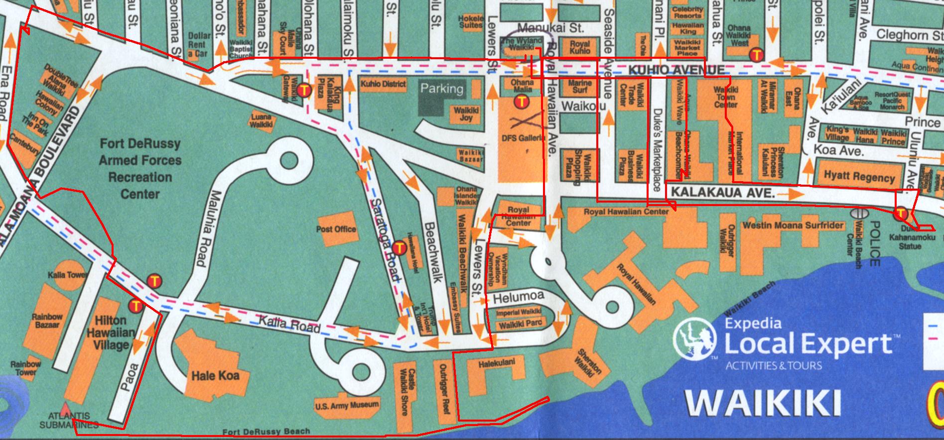 TOP ROW: 1-Webcam broadcasting the Duke Statue on the net 27/7; 2-Gary & Trudie in front of the Duke Statue; 3-The view from Trudie's fav spot on the beach; 4-Mere steps from an ABC Store!; 5-And feet from a Police station; 6-Crazy brick-a-brak sidewalks you'd never find in Canada because of the Freeze/Thaw cycle; 7-Later walk-about takes me past a Dollar Thrifty location!
