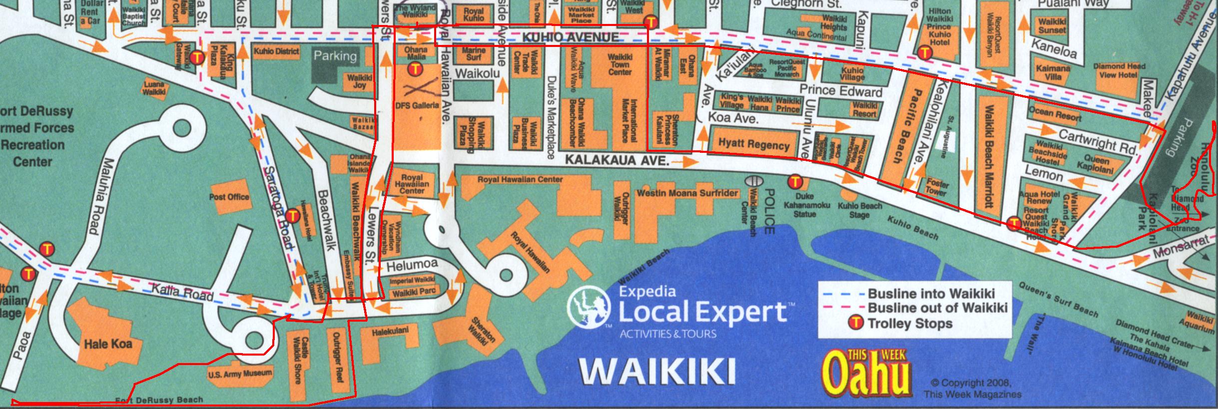 TOP ROW: 1-5 Out to the wide beach on the west side of Waikiki by the Hilton; 6-7 Cutting through Fort DeRussy Park, past the Army Museum