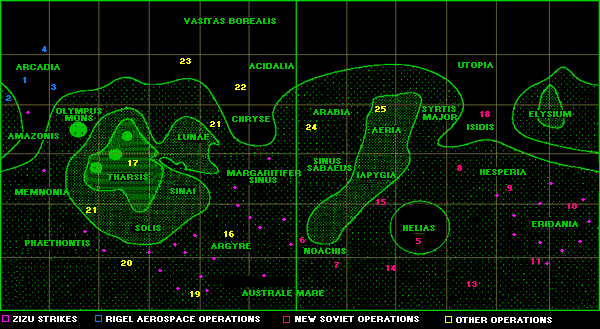 Threat Zone Seven: MARS - Mars is currently undergoing a massive green-house gas build-up and this is by design. In the only example of full co-operation Corporation facilities, Multi-national plants, United Network affiliate and New Soviet controlled bases are polluting the Martian atmosphere on a large scale in an attempt to thicken and warm up the atmosphere, a crucial first stage to terraforming this world. This is not to say Mars is a model of harmony. The planet has numerous regions currently hosting Terran habitation but the primary concerns are: