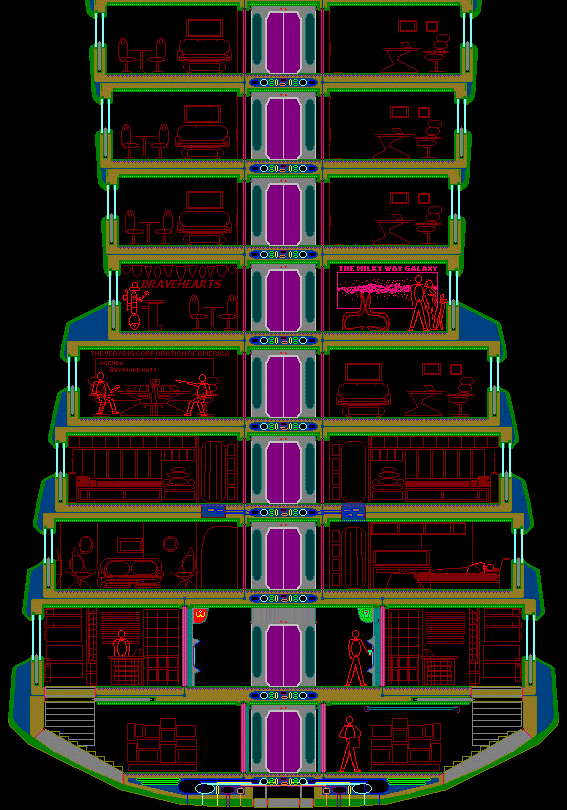 Below is a cut-away of a Lagrange Space Colony LIFE WHEEL. The LIFE WHEEL provides artificial gravity through centrifgual force as it rotates around the central core of the station. The two outermost decks house the MALLWAY shopping complex and its support storage.