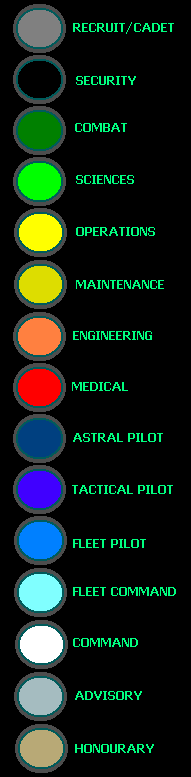 ![]() ![]() SPACE COMMAND DIVISION IDENTIFIER BADGE OPS GROUP DIVISION COMBAT/WING Status RANKS The DIVISION identifier uses a simple colour coding system to indicate which Division Function the wearer performs within their Ops Group.