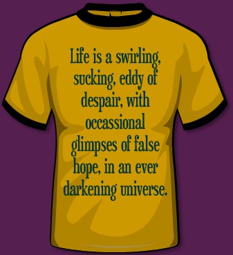 "Life is a swirling, sucking, eddy of despair, with occassional glimpses of false hope, in an ever darkening universe." The antidote to happiness, on a Tee!